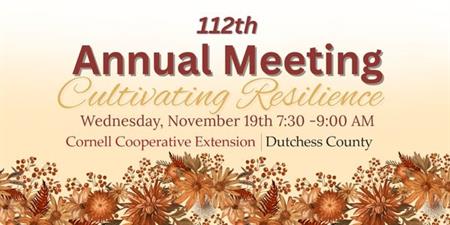 Please join us for the Cornell Cooperative Extension Dutchess County Annual Meeting on Wednesday, November 19th, at 7:30 AM. We appreciate your support and involvement in our vital role in the lives of individuals, families, businesses, and communities throughout Dutchess County. This year, our theme is "Cultivating Resilience."